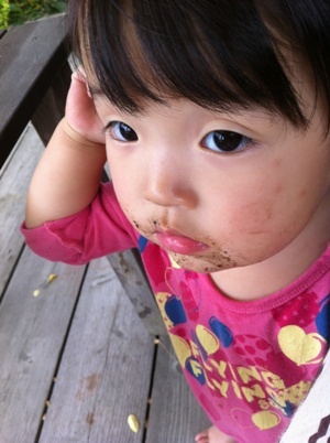 花壇に座ってなにやら一生懸命、砂で遊んでいます。